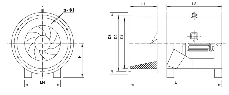 注:進風口可選配消聲頭,以進一步降低噪聲(5~12dB)如圖虛線所示,須在訂貨時注明,常規配置為不帶消聲頭。